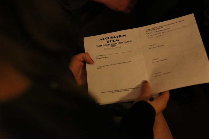 Tables work together as a team to resolve the mystery and the winning team gets a bottle of bubbly!